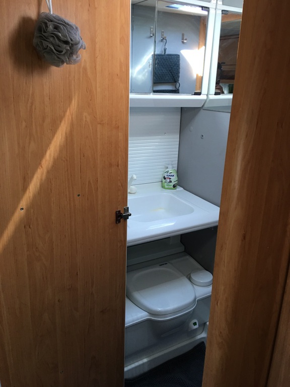 Camping-Toilette (von aussen entleerbar), eine Rundsitzgruppe umklabbar zum Doppelbett (+ kleines Kind) 2,00m x 1,40m, Sitzgruppe hinten umklappbar zum 2ten Doppelbett ca 1,25m x 1,95m,