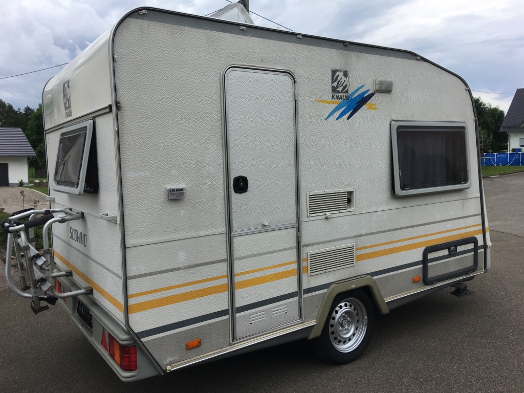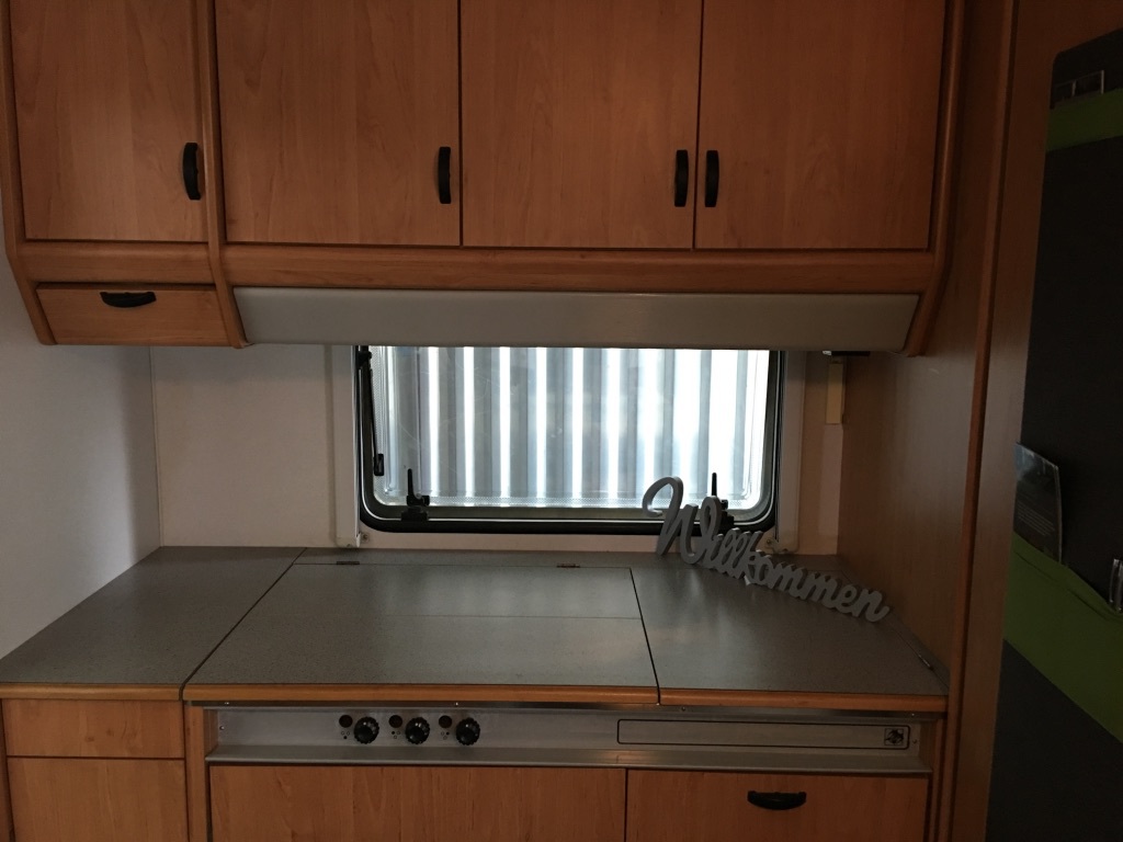 Ausstattung: Markise incl. einer Seitenwand (2te Seitenwand auf Anfrage möglich), Spüle, 3 flammiger Gasherd, Kühlschrank 12V/220V/Gas, Nasszelle mit Warmwasser-Dusche, 10l Gas-Boiler, Truma Gasheizung, Camping-Toilette (von aussen entleerbar), Frischwassertank (von außen befüllbar) + Abwassertank, festes Doppelbett (+ kleines Kind) 2,10m x 1,40m, Sitzgruppe umklappbar zum 2ten Doppelbett 1,90m x1,30m, Gasflasche (5-20kg), TV/DVD mit mobiler SAT-Anlage, Fahrradträger, komplette Küchenausstattung (Geschirr / Besteck usw.), große klare Dachfenster für viel Licht
