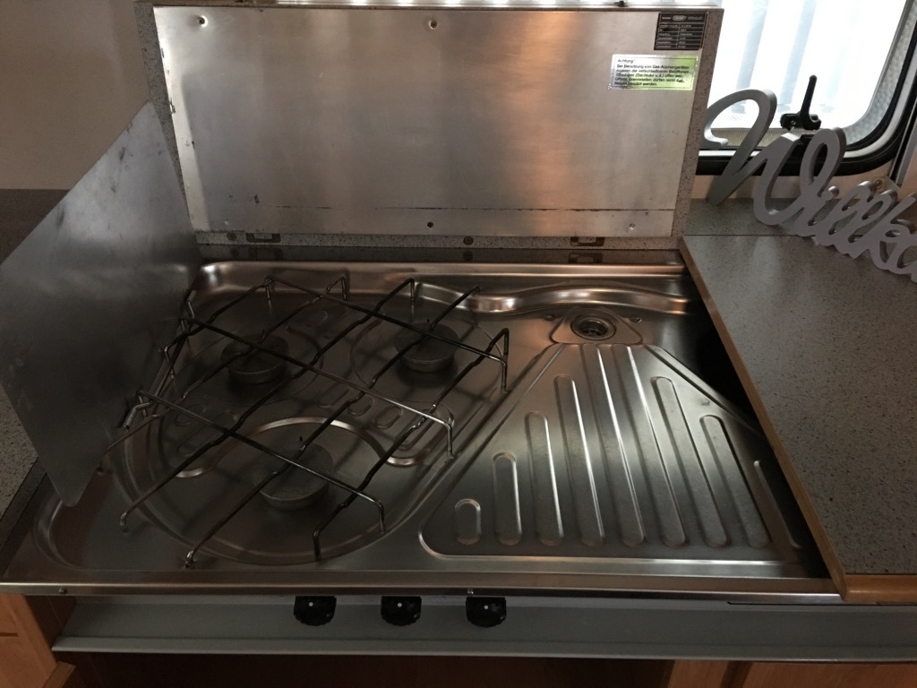 Ausstattung: Fiamme Markise incl. einer Seitenwand, Spüle, 2-flammiger Gasherd ,Kühlschrank 12/V/220/Gas, Kaffeemaschine, Nasszelle / keine Dusche, Truma-Gasheizung, kleine Camping-Toilette, Sitzgruppe umbaubar zum 2er-Bett (190cm x 140cm) auf Wunsch ist hier eine Matratzenauflage erhältlich), 2te kleinere Sitzgruppe umbaubar zum 3ten Bett (190cm x 85cm), Stauraum darüber unklappbar zu einem 4ten Schlafplatz (190cm x 85cm), Bereich kann durch eine Schiebetür abgetrennt werden.