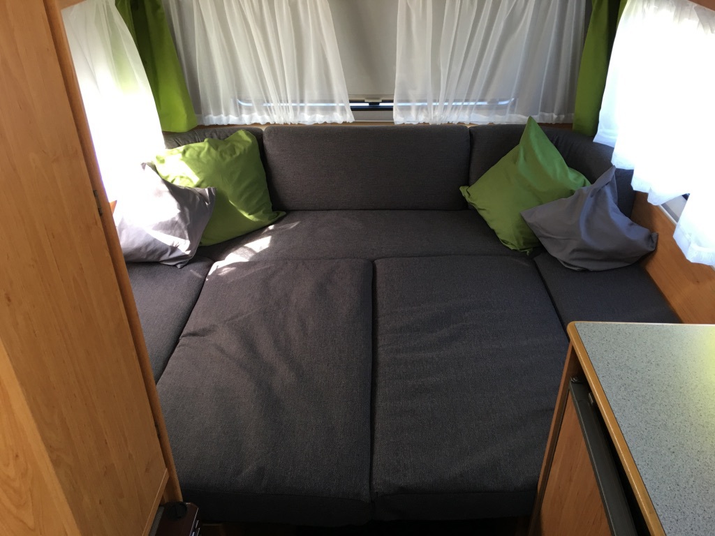 Gasheizung, Camping-Toilette (von aussen entleerbar), eine Rundsitzgruppe umklabbar zum Doppelbett (+ kleines Kind) 2,10m x 1,40m, Sitzgruppe mittig umklappbar zum 2ten Doppelbett 1,25m x 1,95m, 2